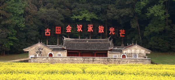 古田会议会址位于福建省上杭县古田镇,原为廖氏宗祠,又称万源祠,始建于1848年。会址为四合院式建筑,座东朝西,沿中轴线依次为前院、前厅、天井、后厅。前后两进,面阔三间,左右厢房。悬山顶屋面,砖木结构,穿斗式木构架,三合土地板。后厅原为古田会议会场,左厢房有毛泽东、陈毅在古田会议期间的办公室,右厢房有朱德办公室。