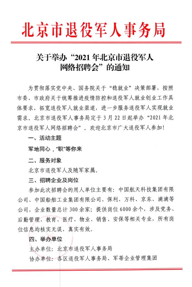 关于举办“2021年北京市退役军人网络招聘会”的通知
