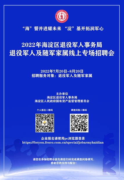 为贯彻落实党中央和国务院决策部署及市、区相关文件精神,促进退役军人由军事人力资源向经济社会发展重要力量有效转化,搭建海淀区退役军人及随军家属与用人单位求职招聘对接平台,推动稳定就业、精准就业。海淀区退役军人事务局、区国资委于7月20日至8月20日举办“2022年海淀区退役军人及随军家属线上专场招聘会(招聘月)”主题活动。
