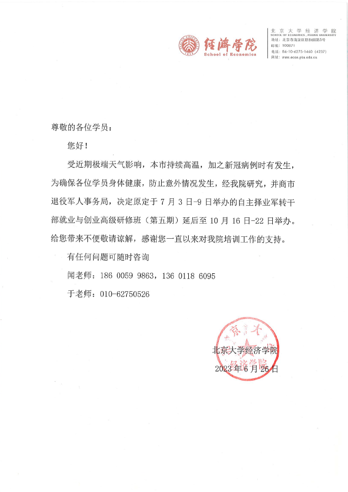关于延期举办“2023年北京市自主择业军队转业干部就业与创业研修班(第五期)”的通知
