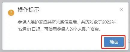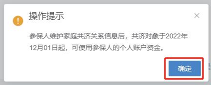 查看【操作提示】:参保人维护家庭共济关系信息后,共济对象于2022年12月01日起,可使用参保人的个人账户资金。点击【确定】按钮。