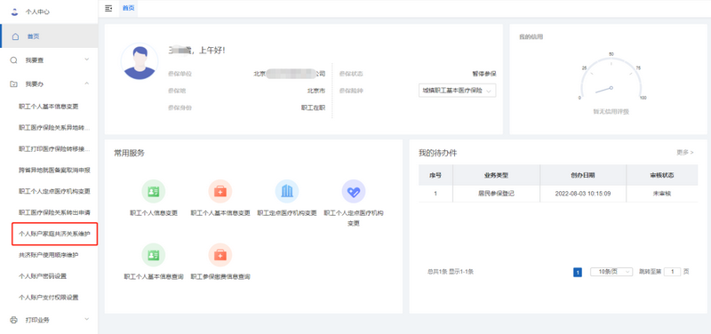 登录“北京医保公共服务平台”,进入“医疗保障个人网厅”界面,点击左侧菜单栏的【我要办】模块,选择【个人账户家庭共济关系维护】功能。