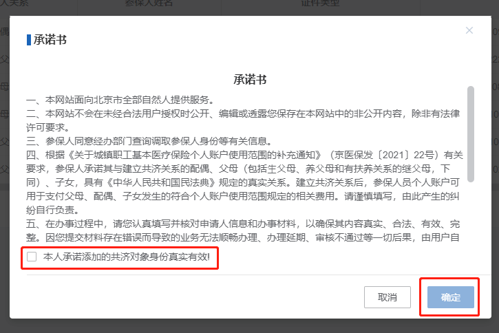 查看承诺书,勾选【本人承诺添加的共济对象身份真实有效!】,点击【确定】按钮。