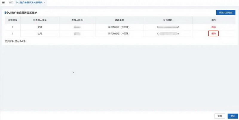 删除共济对象成功后,列表会展示当前有效的共济对象信息,不再展示已删除的共济对象信息,确认无误后点击【提交】按钮。