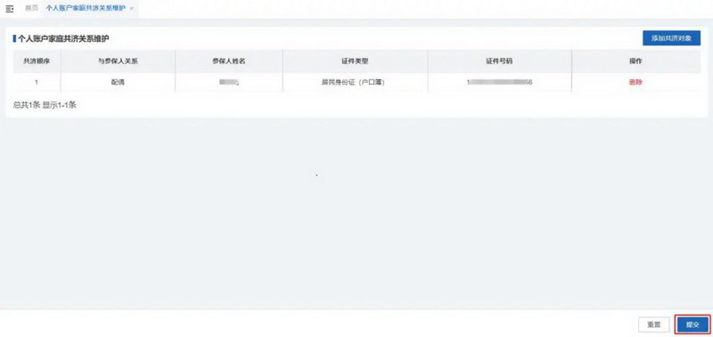 添加新共济对象成功后,列表会展示新添加共济对象信息,确认无误后点击【提交】按钮。