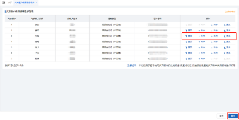 系统展示当前共济账户使用顺序维护列表,根据实际情况点击【置顶】、【升序】、【降序】、【置底】调整共济账户顺序,调整完毕后点击【提交】按钮。