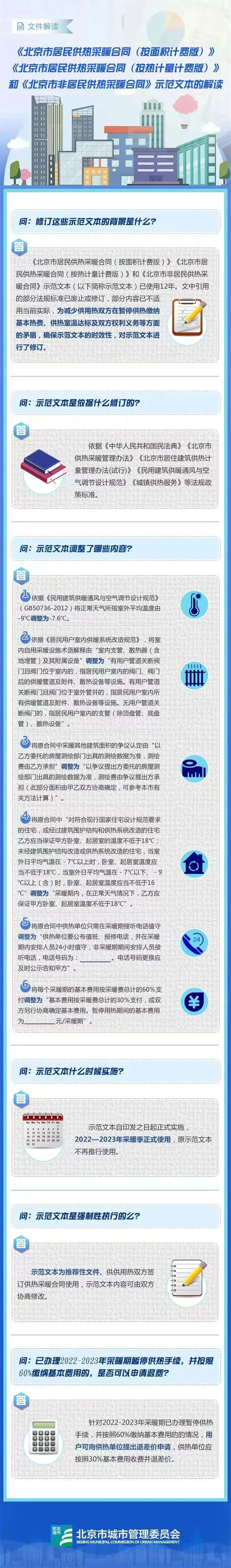 2022-2023年采暖期,已办理暂停供热并按60%缴纳基本费用的分户独立采暖户,可向供热单位提出退差价申请,供热单位应按照30%基本费用收费并退差价。修订后的《北京市居民供热采暖合同(按面积计费版)》《北京市居民供热采暖合同(按热计量计费版)》和《北京市非居民供热采暖合同》共3项示范文本在北京市城管委网站上公布并正式实施。