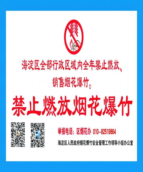 近日,记者从海淀区烟花办获悉,为加强烟花爆竹安全管理,保障公共安全和公民人身、财产安全,持续改善区域环境空气质量,按照《北京市海淀区人民政府关于行政区域内全面禁止燃放烟花爆竹的通告》(海行规发【2021】6号)规定,2023年,海淀区将继续严格执行全域禁放烟花爆竹,不再设立烟花爆竹临时销售点。
