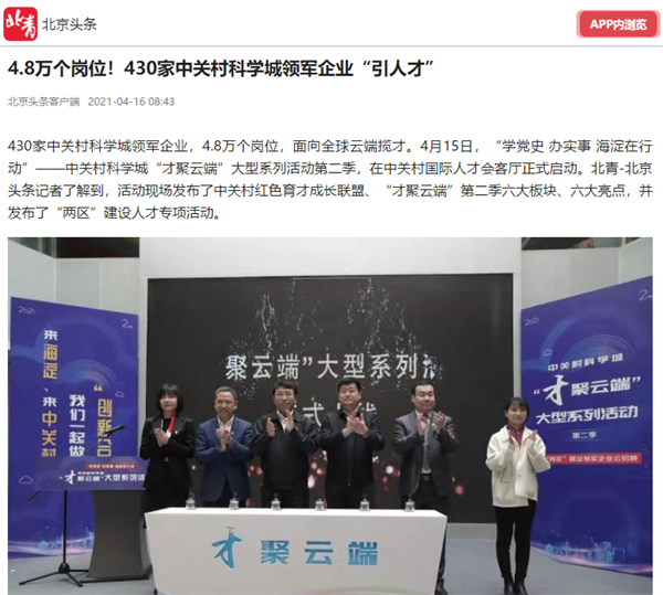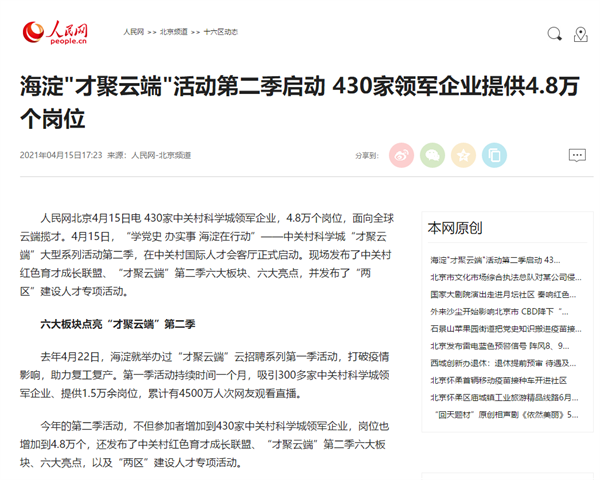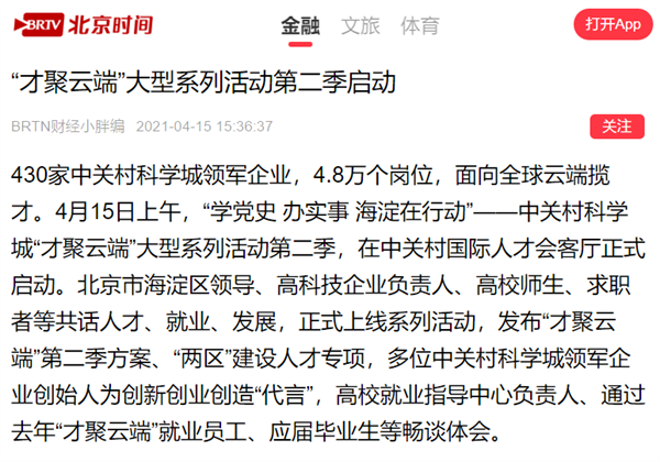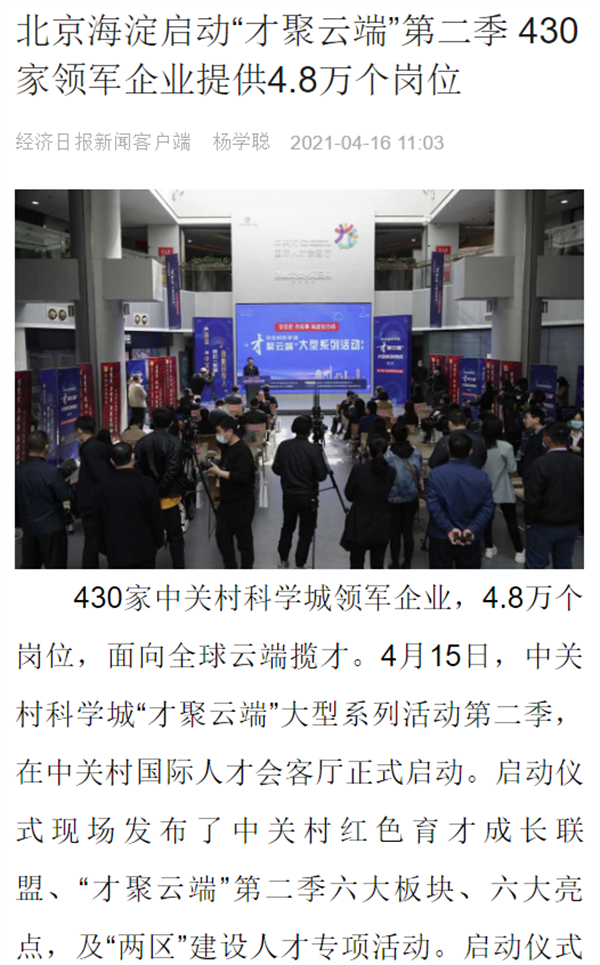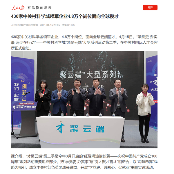 海淀区人力社保局和海淀区融媒体中心携手主办的“学党史 办实事 海淀在行动”——中关村科学城“才聚云端”大型系列活动第二季4月15日启动。得到央视、人民日报、人民网、经济日报、中国科技网、北京日报、新京报、北京头条、千龙网等中央、市级媒体接续报道。