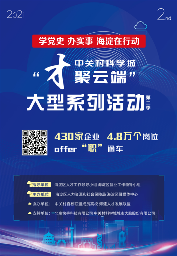 2021年是中国共产党成立100周年,是“十四五”开局之年!“才聚云端”第二季重磅升级,作为今年3月开启的“红耀海淀谱新篇——庆祝中国共产党成立100周年”系列活动的重要组成部分“才聚云端”第二季启动仪式上成立中关村红色育才成长联盟。把引才、聚才、育才结合起来,“才聚云端”第二季活动吸引了430家中关村科学城领军企业携4.8万个岗位面向全球云端揽才。