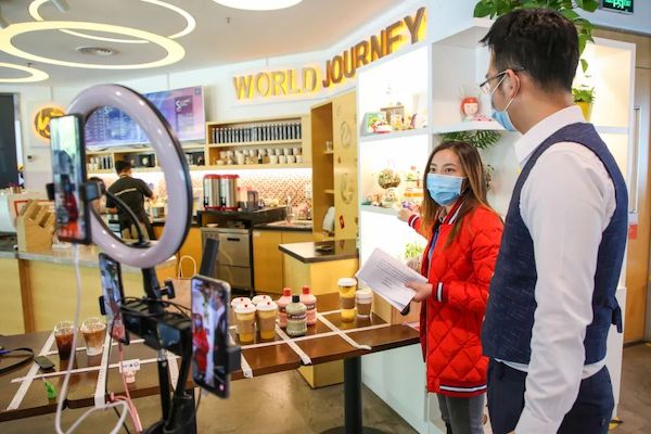 △滴滴HR和海淀融媒主播正面对镜头,向网友介绍企业内温馨的咖啡厅、各种特色文化社。