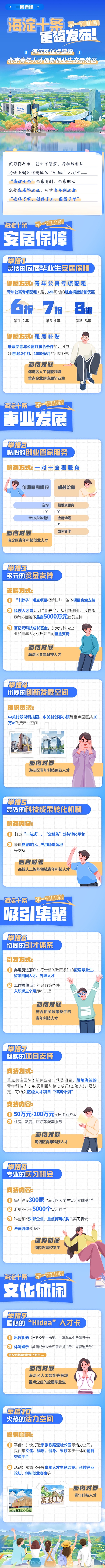发布一批人才引育项目,构筑“近悦远来”生态。聚焦人才引进、项目支持、实习机会三方面,让人才“引进来、育起来、活起来”。在人才引进方面,提出为符合相关政策条件的应届毕业生、留学回国人才、外埠人才办理引进落户,符合政策条件的,入职满3个月即可办理工作居住证;在项目支持方面,提出重点关注国际创新创业赛事获奖项目,落地海淀的青年科技人才或项目团队核心成员(创始人),经认定,可纳入区级人才项目“海英计划”,享受50万元-100万元发展奖励资金及配套服务;在实习机会方面,提出每年建设300家“海淀区大学生实习实践基地”,汇集不少于5000个实习岗位,为海内外高校学生按需匹配实习机会。